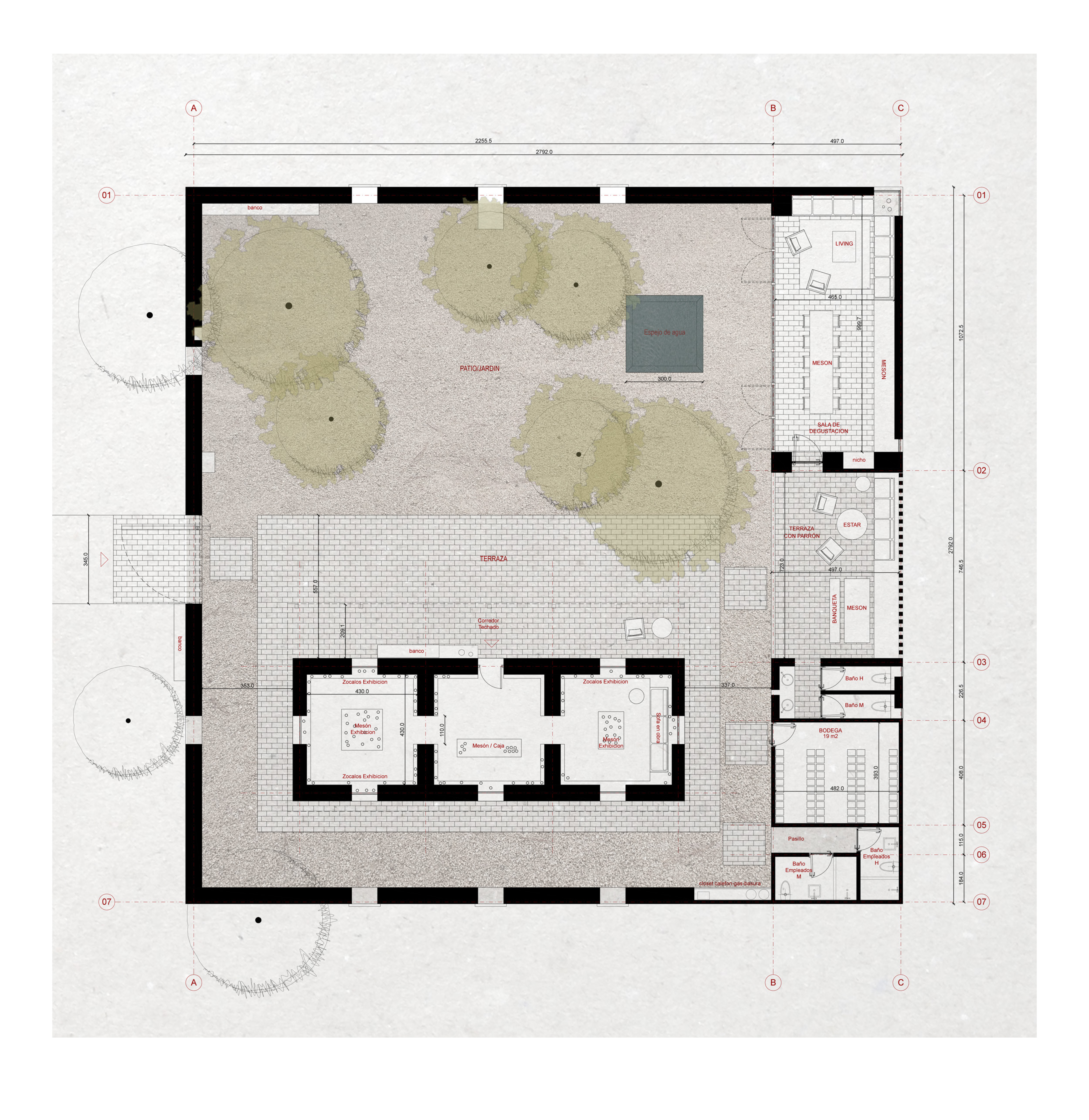 In addition to sobriety and elegance (i.e., choosing wisely), security is a fundamental quality of the traditional adobe architecture of the central valley, which creates hermetic buildings with few windows, but also provides the protected and open interiority of courtyards and corridors. Following this tradition, the project establishes a 28 x 28 m perimeter wall around the existing house, allowing for the creation of an interior courtyard and also containing complementary programs to the store: the cellar, bathrooms, and tasting room.