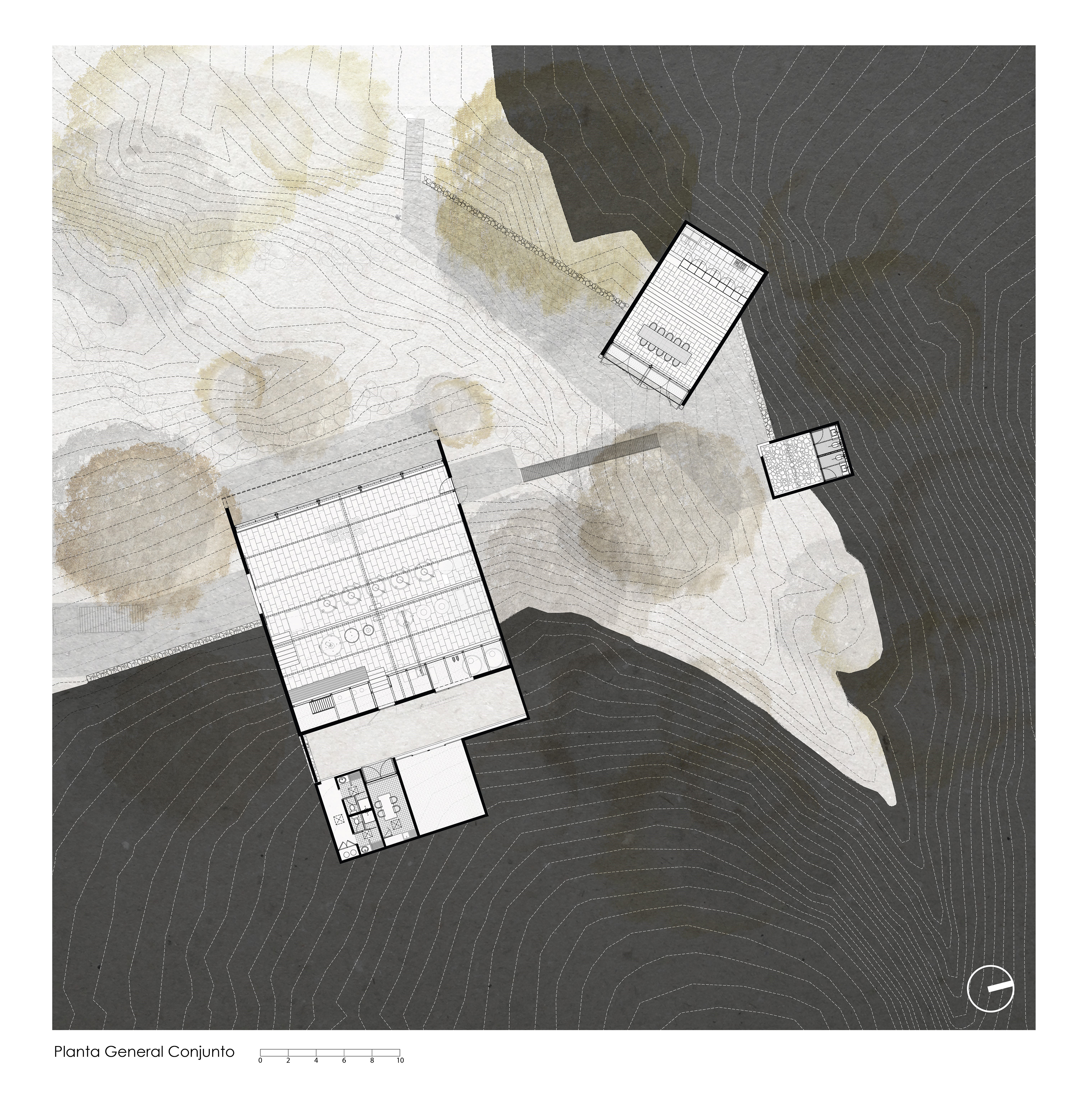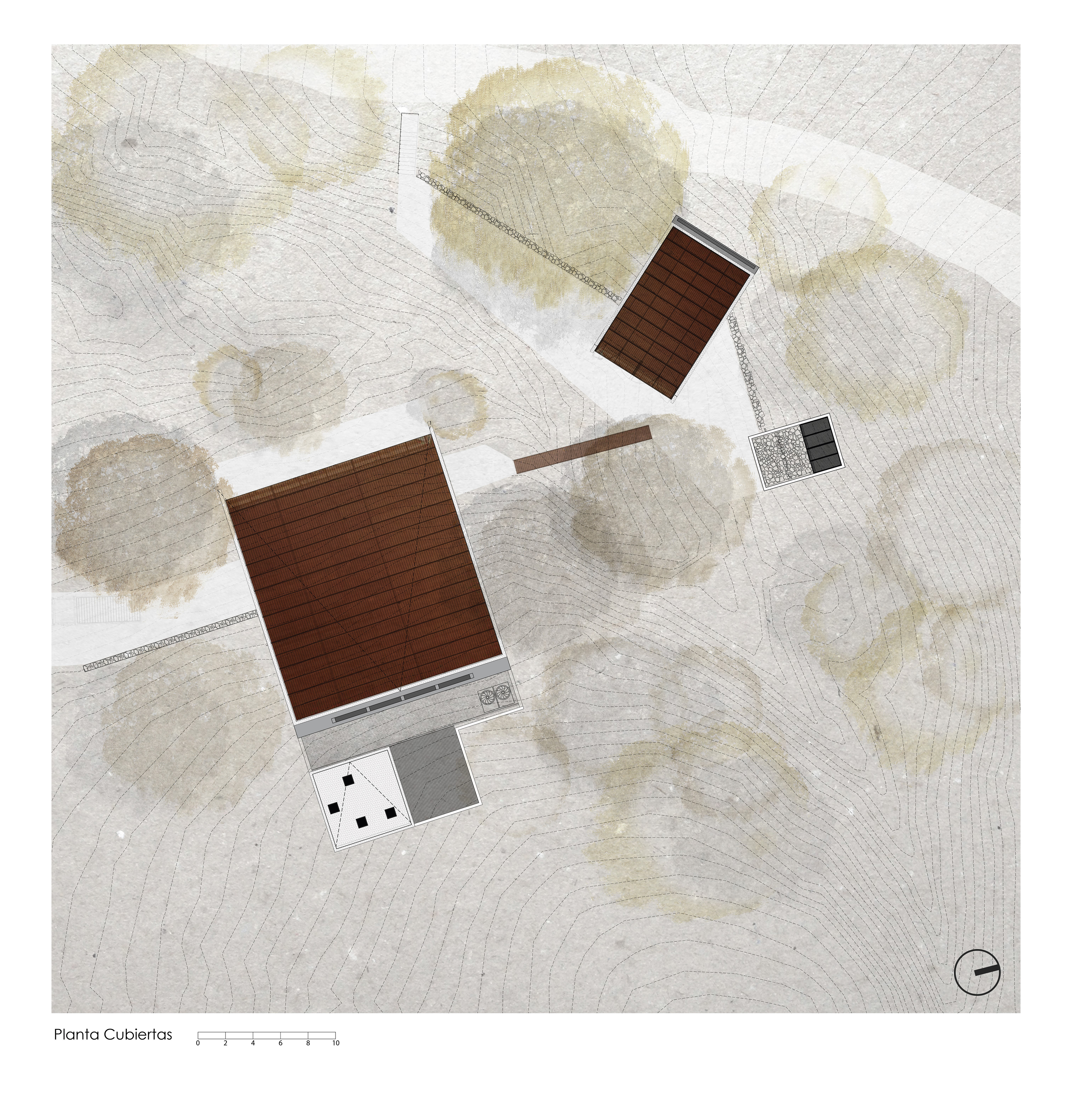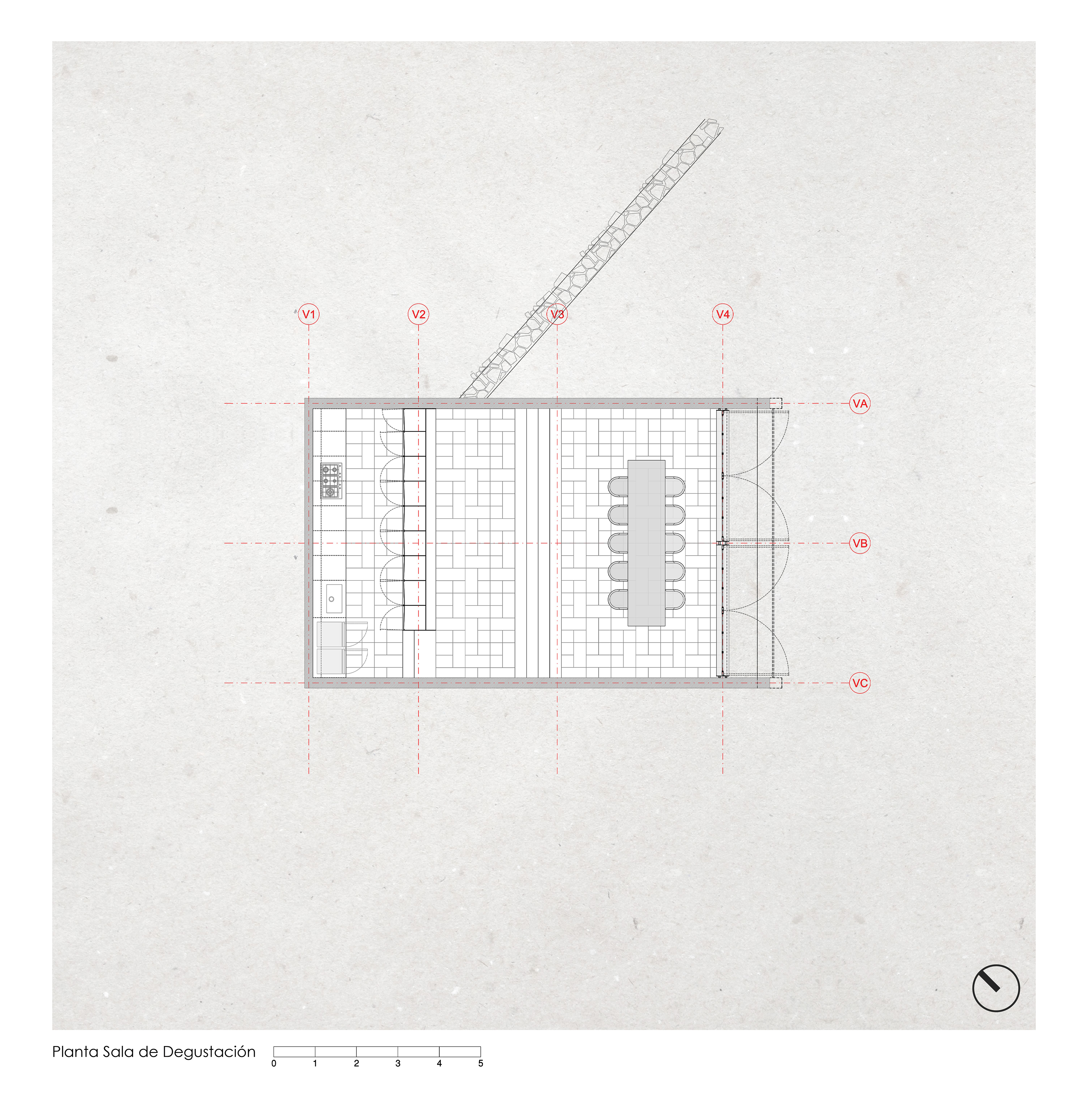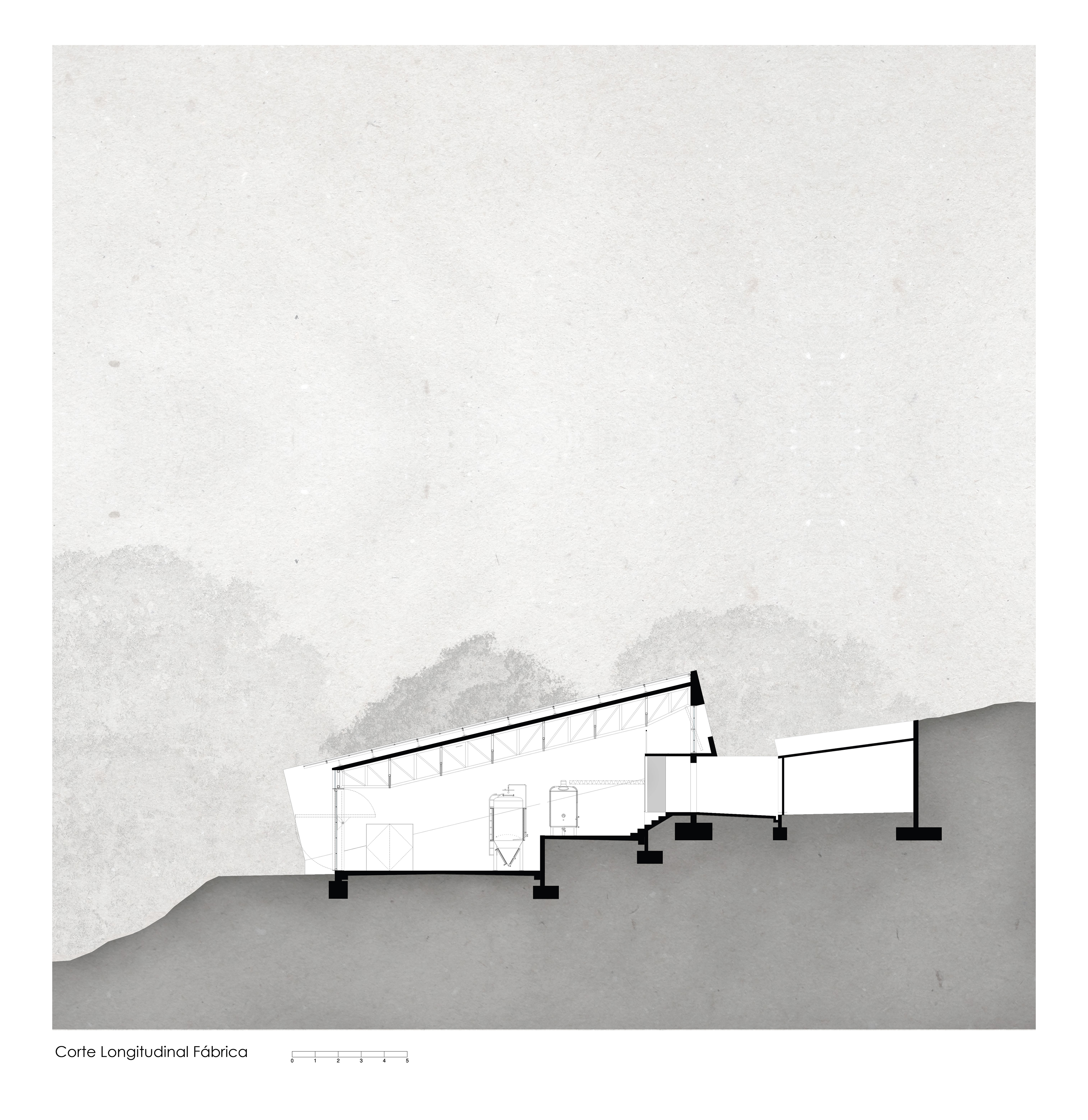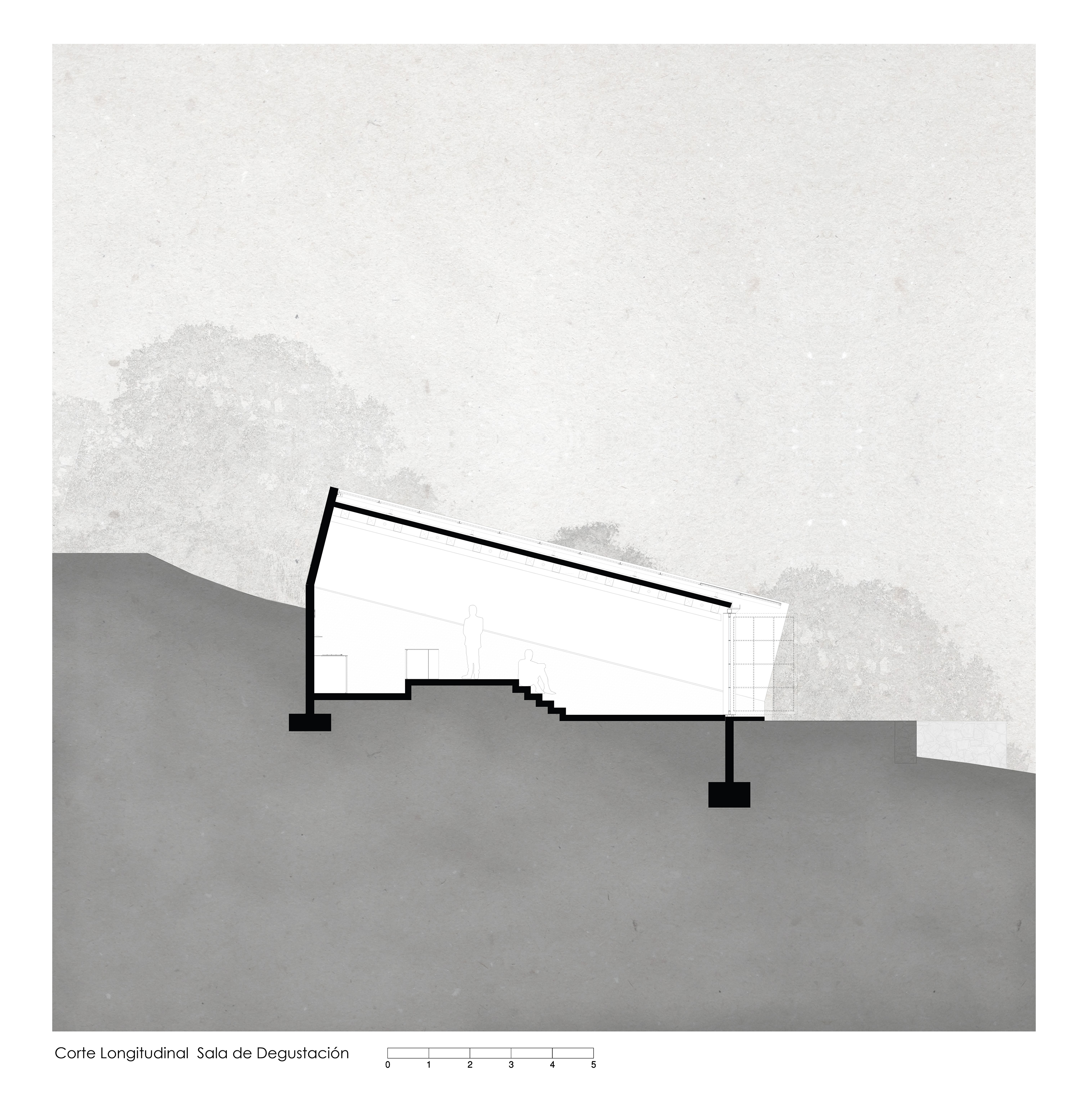 The project is constructed using four primary materials: concrete for the main structures, steel for windows, doors, and roofs, basalt for the pavements, and reclaimed laurel wood for the beams in the tasting room. The concrete walls rise from the earth, angled to follow the terrain’s slope, with minimal openings that evoke the ruggedness of a ravine. These walls seem immovable, yet their placement reflects the invisible forces that have shaped the pre-Andean landscape over time. The roofs, visible from many perspectives, are a defining visual and environmental feature of the design. Insulating panels are topped with corten steel grating, providing shade and lowering the roof temperature. The rust-colored steel forms large, sloping planes that echo the earth and hills around them, shifting in color with the changing light of the day.